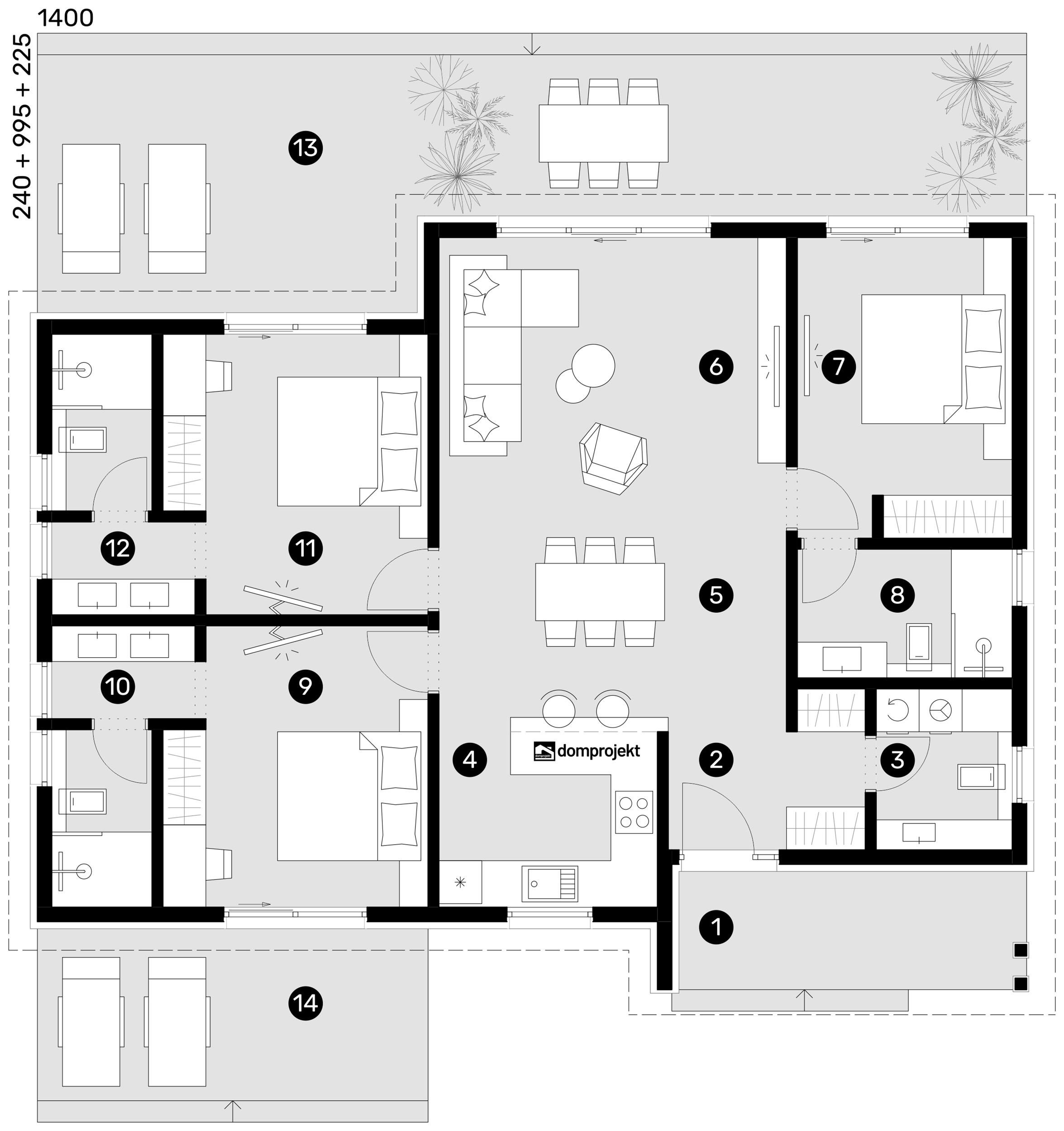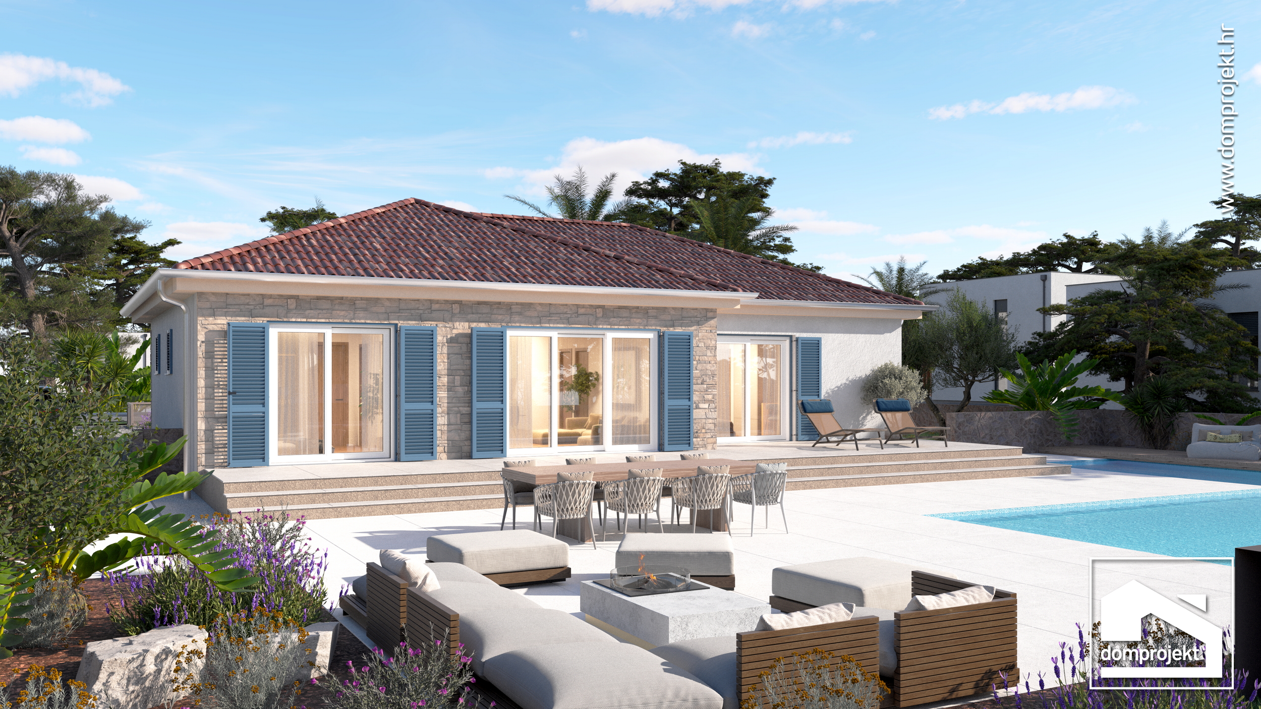 Osim vanjskog izgleda s kamenom na fasadi i upečatljivim, plavim griljama, ova montažna niskoenergetska prizemnica ističe se i obiljem vanjskog prostora za uživanje te primamljivim tlocrtnim konceptom.